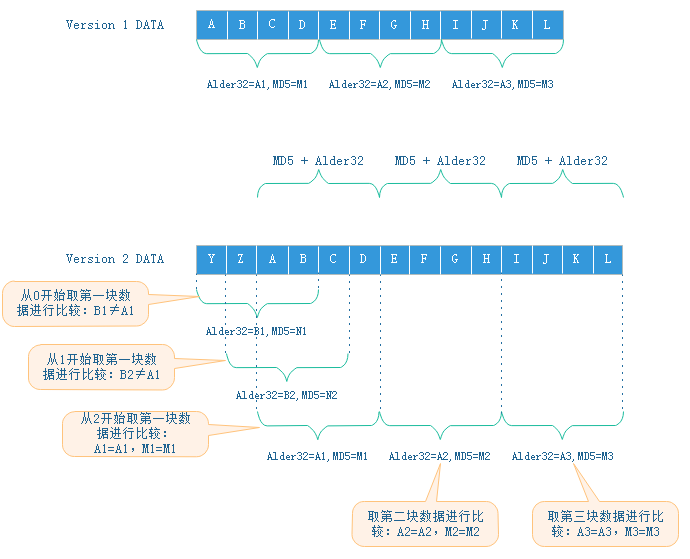- 如果两个块的 Alder32 值不同,则表示文件内容是不相同的。接着,把文件(Version 2)从1字节开始切出一块,再对比 Alder32 的值。如此循环。